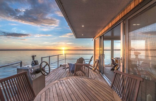 The houseboat for 2 persons is individually furnished on 40 m² and has a bedroom and living room, kitchenette, bath, sauna, covered terrace, sundeck and rowboat. You will love the individual equipment and color design.