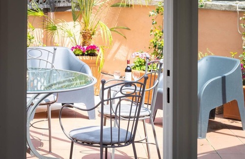 Beautiful penthouse located in via Lucullo, a short distance from Piazza Barberini, Via Vittorio Veneto and Piazza di Spagna. The property is located on the fifth floor of a wonderful building with a lift that stops on the fourth floor, so the apartment is accessible via a flight of stairs. The apartment consists of a wonderful living room with great brightness thanks to the window overlooking the terrace, this room is equipped with sofas including a sofa bed, tables with chairs and TV, direct access to the outside, continues with an eat-in kitchen and fully equipped, a bathroom with shower and a double bedroom. The wonderful terrace is one of a kind, equipped with outdoor furniture and many pots with plants and flowers that give a magnificent color to this terrace. The classic style furnishings with some modern elements give a touch of great class to this apartment. The amenities include air conditioning in all rooms, washing machine, smart TV and wifi. The area is strategic for visiting the major points of interest in the historic center of Rome on foot, we find the Barberini metro stop a short distance away. Perfect apartment for couples or small families who want to spend a short or medium-term stay in the Eternal City.