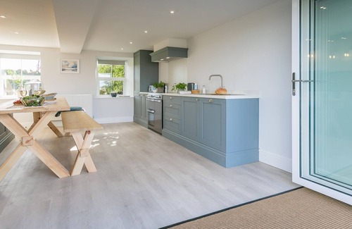 The kitchen is a hi-tech gleam of everything you could need. A cook's dream with distracting views to stir up inspiration for the supper. With a handsome table for headland-view dining - a great place to gather for meals and the quality of light makes it a grand spot. Out on the balcony, for a fish supper, you can smell the sea on the wind. If chef wants a night off, pop down to the Oyster Catcher for local food and great ales – also with a view.