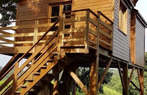 You want to sleep head in the stars and feel the wind in the trees, Christelle welcomes you in his cabin perched at 4 m height in a big hundred year old letchi. This cottage is one of three houses of the area, located in Ste Suzanne, in peace, in a tropical orchard with breathtaking views of the Niagara waterfall, one of the most beautiful on the island.