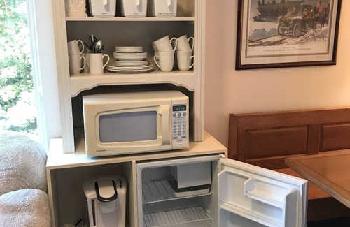 On this lower level you will find a cozy arrangement perfect for morning coffee and conversation with a couch, loveseat, a small kitchenette that houses a microwave, a Keurig stocked with coffee pods, creamer and sweeteners and a small refrigerator/freezer added for your convenience and comfort. An Amish-made eating nook table for 6 is an inviting breakfast or snacking spot. A full-size bathroom with tub/shower and fluffy white towels, shampoo, conditioner, body wash and toilet paper are provided.