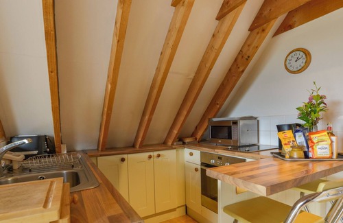 Amenities: Central heating. Compact and well equipped kitchen. Electric 2 ring hob, oven and grill, microwave, washing machine/dryer, fridge with freezer compartment and breakfast bar/chairs. TV with freeview, DVD, WIFI. Fuel and power inc in rent. Bed linen and towels inc in rent. Off road parking. Small balcony with table/chairs and further sitting space at base of steps, shared use of owner's garden. One dog welcome. Sorry, no smoking. Shop 3 miles, pub 1 mile. Note: The property is up wooden stairs on the first floor.
