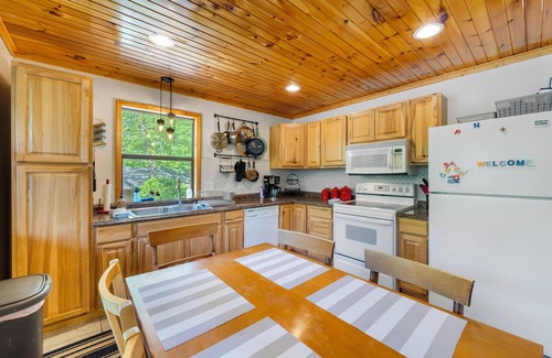 NEW TO VACATION RENTALS 2024! You'll be impressed when walking in this the awesome beverage bar and wood stove/fireplace, new 75" tv, to the updated kitchen cabinets and bathrooms. There's space to bring the entire crew to enjoy all the lake has to offer! The main floor offers a large bedroom with king bed, bathroom, laundry room, kitchen, dining and , the best part is the great screened in deck to enjoy outdoor living year round. Then, head downstairs and you'll find another living area that is furnished with a twin bed with trundle, 2 more large bedrooms (one is a bunk room that sleeps 6!), and a large updated bathroom. You'll appreciate the outdoor entertaining space as well - it's where you will want to spend most of your time! This home offers an incredible dock with a slip for your PWC, a HUGE swim platform, 4 kayaks and a water mat, and a super cool observation deck with high dive that you will NEVER want to leave! The owner has a boat in the boat slip but you can tie up to the side of the dock. This home is family friendly and in an ideal location toward the back of a cove at the 2.5 mile marker of the Niangua Arm in beautiful Lake of the Ozarks. It is close to the Cave Bar & Grill, Nautifish Rum Bar, Captain Ron's Bar & Grill, and local marinas. You can always book with confidence through Four Seasons Property Management, Lake of the Ozarks!