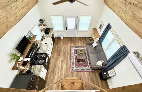 This tiny cabin is a two bedroom and 1 bath. Downstairs you have a spacious living room and kitchen that includes everything you would need for a comfy stay. Couch does fold out to sleep one adult. There is a bar table to eat or do your computer work at. The kitchen has a refrigerator, stove, microwave, drip style coffee maker and all the essentials needed to eat, cook and drink. The downstairs bedroom includes a queen-size bed and cubical dresser. The upstairs bedroom is accessed by climbing the rustic ladder where you'll find two full-size beds. The bathroom is downstairs and is very roomy. It has a walk-in shower, toilet and vanity. The bathroom does come with a set of toiletries for your trip which includes; shampoo, conditioner, body wash, and lotion.