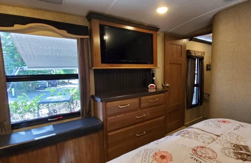 This on-site Luxury RV comes TURN-KEY and sleeps 6! Just bring your family and food! Enjoy a CUSTOM Tiki Bar with outdoor kitchen (grill and outdoor refrigerator), plenty of seating and entertaining area as well as a firepit area. There is one Master Bedroom with a King bed and the two couches in the front Living Room fold out to Queen beds. The living area is in the back and doubles as a second bedroom as needed. There are also 2 comfy recliners in the living room. The full size bath offers a stand up shower. There is also a dining table for 4 and the kitchen is fully stocked.