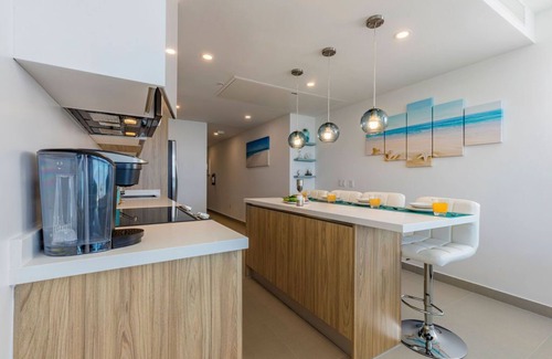 This air-conditioned two-bedroom suite located in a 5th floor at Azure Beach Residences, features one king bed and one queen bed, two bathrooms with shower, hairdryers, and a fully equipped kitchen. Dining/living area has an amazing view of the Caribbean and a sofa bed which unfolds to a queen-size bed. Comes with washer and dryer. One step into the balcony through sliding doors and the Caribbean Sea is there, magnificent. Free Wi-Fi and TV’s in all rooms.