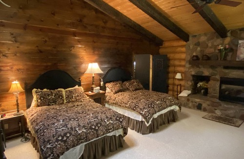 The cabin features European craftsmanship throughout the great room, dining area with hardwood floors, impressive log beams. The master EnSuite has a fireplace and large hand hewn timbers, Jacuzzi tub & walk thru/walk in closet.