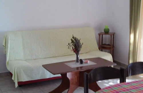 Apartment can accommodate 6 guests. Beds are situated in 2 sleeping rooms, but also in the living room, within 50m2. Guests can use a private terrace to enjoy the warm summer evenings. The apartment offers the sea view. Food can be prepared using barbecue which is shared with other guests too. This accommodation unit welcomes pets at no additional costs.