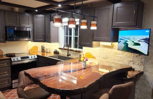 • Kitchen: Walnut countertops, bar table, fully equipped, modern appliances, induction range, 4in1 Barista coffee maker, + kitchen essentials, phone chargers.