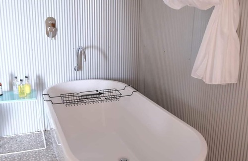 The bathroom has a large bath/shower in a cleverly appointed corrugated iron and pebble finish with lost of room for bathing and pampering, with a door to the outside patio that looks out over a bucolic scene of farmlets and an occasional train arriving from Sydney. It also has a covered patio that is perfect to use for sunsets, meals in the cooling evening, or watching a storm unfold over a wide New England sky