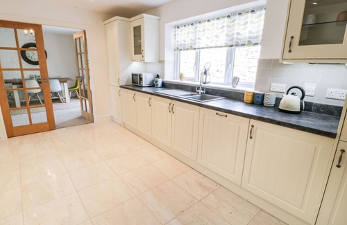 Amenities: Oil central heating with underfloor heating (ground-floor only). Electric Rangemaster with oven and hob, microwave, fridge/freezer, washing machine, tumble dryer, dishwasher. Smart TV with full Sky package, Sports and Movies, WiFi, selection of books and board games. Fuel and power inc. in rent. Bed linen and towels inc. in rent. Highchair, travel cot and stairgate available. Off-road parking for 4 cars. Enclosed rear garden with lawn, patio and furniture. Three well-behaved dogs welcome (to be kept downstairs and out of the bedrooms). Sorry, no smoking. Shop 0.7 miles, pub 1.6 miles, beach 2.1 miles. Note: There is a Good Housekeeping Bond of £200 for this property. Note: No hen/stag or similar groups. Note: There are sloping ceilings in king-size bedrooms. Note: Check-in from 4pm, check-out at 10am