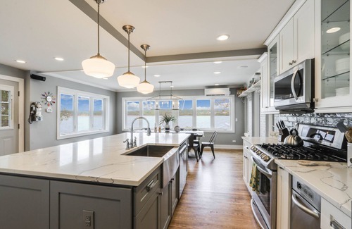 The kitchen is the heart of this home and not only offers spectacular views of the lake, beach, and and cabana, but it is a chef's dream! You'll find three ovens, two refrigerators and its fully stocked with all the equipment you will need as well as a tv. There are new white kitchen cabinets with full extension and soft close drawers, white quartz countertops, an enormous island with seating for 6 as well as a large table that seats 10. There's an additional table for 4 in the game room next to the kitchen. Off the kitchen is a powder room, full size washer and dryer and a screened porch overlooking the yard and lake.