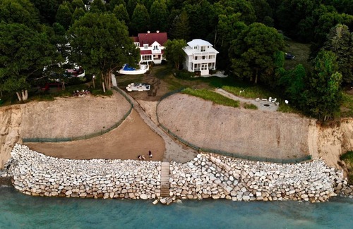 The home is well equipped with a chefs kitchen overlooking the dining room and screened in wrap around porch overlooking Lake Michigan. Five bedrooms, with one suite on the first and second floor.