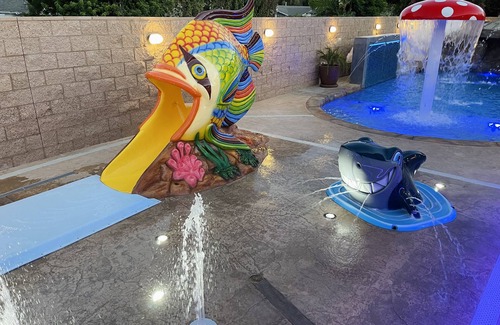 Private estate with heated water park on a 1/4 acre, 1 mile to Disneyland! Enjoy luxurious themed bedrooms, arcade game room, 7-hole golf course, swing-set & slide playground, water splash park, spa, pool, water slide, grotto, waterfall & volcano, fire pit, patio, and outdoor BBQ. This estate offers luxury living and entertaining at its finest. Prime location next to Disneyland and the Anaheim Convention Center.