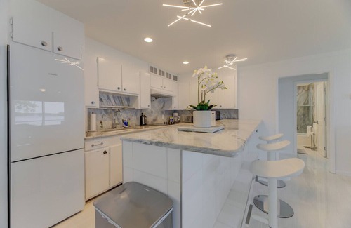 This kitchen is beautifully decorated with a marble backsplash and counter tops. The bar top has 3 stools for extra seating. The washer and dryer are located in the kitchen for you to take care of any laundry before heading home.