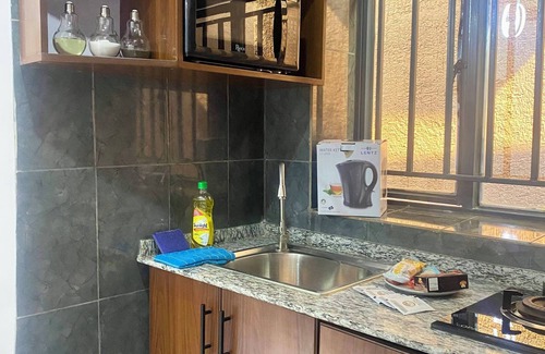 From the moment you step-in, you feel calm in the living room from the modern and stylish design, well spaced and clean. 3 Single sofas, beautifully sculpted stylish center table, wireless internet, Tv Unit and a TV ( with Netflix, YouTube, primevideo and local channels for entertainment). A kitchen area with the essentials which includes a cooker, pots and pans, oven, spices, oils, 19 liters of drinking water, kitchen utensils etc. The living room is well scented with nature diffusers to keep that fresh natural smell.