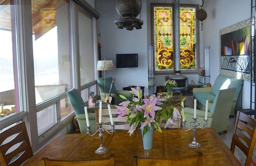 Elegant + chic 1970’s 2 bd/2 bath home with a sleeping loft in exclusive neighborhood 10 mins from Aspen. Outrageous views on 5 secluded acres. Cathedral ceilings, floor to ceiling glass windows, vintage stained glass and conversational art give this unique home fantastic entertainment possibilities.
