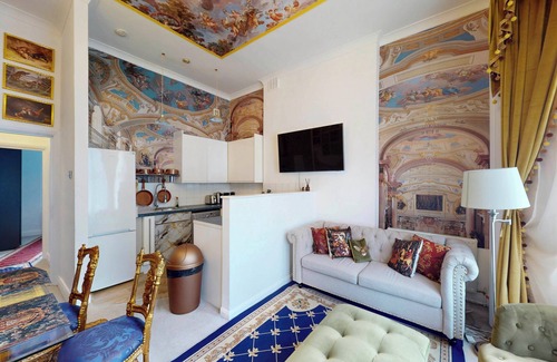 This uniquely styled apartment features a regal dining and lounge area adorned with rich textures, statement decor, and elegant finishes. Ornate ceiling art adds a dramatic flourish, creating a space that feels both luxurious and theatrical.