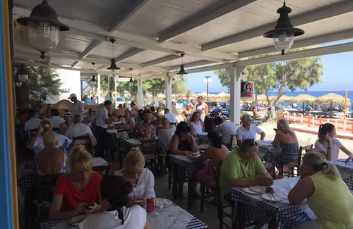 We are located on the seafront in Perivolos Beach, just 400m away from a market in and 100m away from the bus station.
