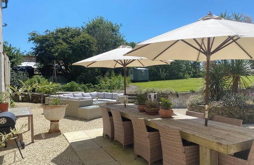 The property has a spacious kitchen, dining and seating area including an original open fire that brings everyone together. Two further traditional comfortable sitting rooms, one with a wood burning stove provides generous space for evening relaxation. French doors open onto a south facing terrace with a garden laid mostly to lawn There is a BBQ, large outside table and relaxing seating area to enjoy.