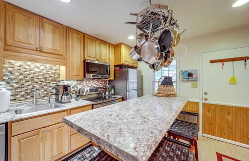 HOME FEATURES: Bar seating, ceiling fans, wood-burning stove, laptop-friendly, deck, books