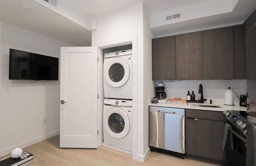 Fully equipped kitchen includes microwave, stove, oven, refrigerator/freezer, dishwasher, toaster, coffee maker + coffee essentials, kettle, mixing bowls, silverware, pots & pans, spices, olive oil, and more.
