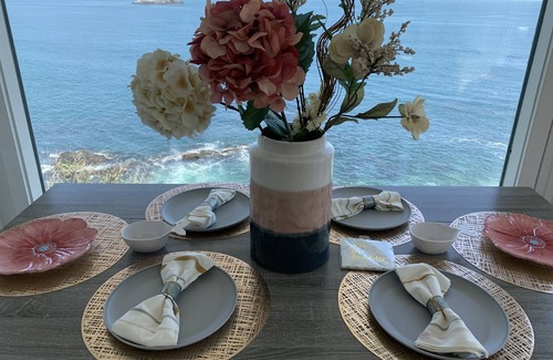 Spacious, oceanfront home at water's edge. Unspoiled panoramic views of the ocean and coastline from an expanse of windows. Mesmerizing views of the ocean from every room. Five/six bedrooms plus additional sleeping on futons & and roll-away beds. Relaxing on the 45 ft deck with the surf below is breathtaking. The side deck is ideal for early morning breakfast or evening dining.