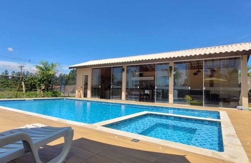 The outdoor area, in addition to a complete bathroom with shower for bath, has a bounce house of 4.20 up to 120 kg, hammocks, a pool table, barbecue, pizza oven, wood stove and all utensils such as house, pots, cutlery, gas stove with oven and a brewer with a capacity of 500 liters.