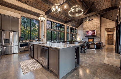 Beautiful stained concrete floors stretch out as far as the eye can see across the open-concept living room. The soaring ceilings, rustic beams, and incredible views, cultivate a sense of space and wonder from the moment you step inside. Relax on the cozy couches in front of the gas fireplace, enjoy your favorite shows on the smart TV, or simply soak in the awesome views.