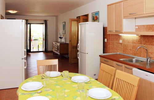 9-room semi-detached house 250 m2 on 2nd floor. Living/dining room with air conditioning. Exit to the terrace. 1 room with 2 beds. 1 room with 1 french bed (180 cm), shower/WC. Open kitchen (4 hot plates, oven, dishwasher, freezer, electric coffee machine). Shower/WC. Upper floor: (exterior staircase) living/dining room with kitchen corner and air conditioning. Exit to the balcony. 1 room with 1 french bed (180 cm). 1 room with 1 french bed (160 cm), shower/WC. Living/dining room with air conditioning. Exit to the balcony. 1 room with 1 french bed (160 cm). 1 room with 1 french bed (180 cm), shower/WC. Open kitchen (2 hot plates, oven, electric coffee machine). 2 showers/WC. No heating option. Balcony 15 m2, terrace 20 m2, roofed. Balcony furniture. Facilities: Internet (WiFi, free). When there are less than the maximum number of guests staying at the property, one floor will not be available for use.