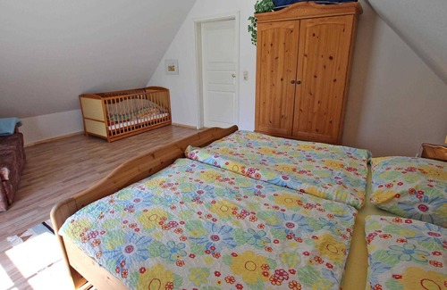 In Waldrandlage, on a 4 acre plot are located next to the house and the horse stable of the owner a 105 sqm holiday home for up to 6 people and upstairs of the farm building a small apartment for two people. Around the house and apartment are available to guests about 1,000 square meters of natural land. The entire property is ideal for a riding holiday, as your own horses travel with you and can be accommodated on site. In addition to the house are two guest horse boxes (for a fee, 8 EUR / day / pet), which can be used by tenants of the apartment on request. Paddocks for the pasture of the accompanying horses are also available.On the large nature plot are also a small petting zoo, a small playground and in summer an idyllic orchard with lawn, which can be used by the guests.The further equipment details of the house or the apartment can be found in the room description. The total price includes final cleaning, water and energy consumption (for the apartment energy costs according to consumption!) as well as bed linen, towels. To be paid on site: Pet fee (if applicable) 3 EUR / night, Fee for guest box (if applicable) 8 EUR / night / animal, Energy costs according to consumption (holiday apartment) Pets: A pet is only allowed in the cottage (3 EUR / T). The pet must be registered with the booking. Several animals require before booking the consent of the owner. If an entry note is not possible, a late registration must be made.