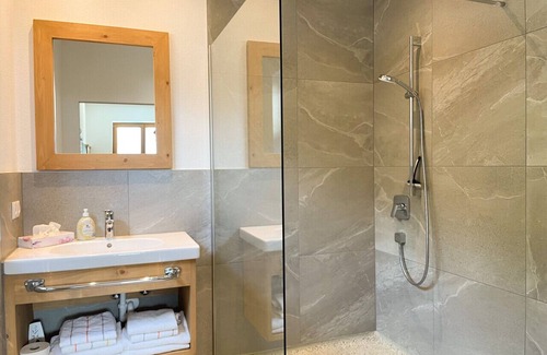 The lovingly renovated vacation home has eight cozy bedrooms, each with its own modern bathroom - the ideal comfort for a relaxing break with family or a larger group of friends. On the first floor there is a spacious common room with a fully equipped kitchen, as well as two bedrooms, each with a double bed, two single beds, a TV and a modern bathroom with shower and WC. A separate WC provides additional comfort.