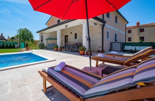 Beautiful single-family house "Villa Sa-Ra", built in 2019. In the hamlet Nova Vas, 2.5 km from the centre of Brtonigla, 8 km from the centre of Novigrad, in a quiet, sunny position, 8 km from the sea. Private: property 300 m2 (fenced), garden with lawn and wildlife garden, swimming pool angular (7 x 4 m, 30 m2, depth 150 cm, seasonal availability: 15.Apr. - 10.Oct.) with internal staircase. Outdoor shower, garden furniture. In the house: internet access, washing machine. Parking (for 4 cars) at the house on the premises. Shop 200 m, supermarket 8 km, restaurant 200 m, pebble beach 8 km, rocky beach 8 km. Walking paths from the house 50 m, cycle lane 100 m, children's playground 15 m. Nearby attractions: aquapark 3 km. Organizing a party is not allowed.