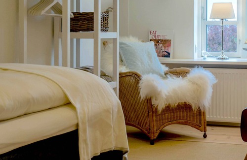 Our country house is stylish and modern renovated and equipped with old and new furniture cozy and attractive. It offers enough space for joint activity as well as retreat points. Great for holidays with friends or family. Right at the entrance opens for you a large modern dining room with a large table for 10 people. A stove will give you warmth and comfort in the cold season. The stylish sofa and reading corner make it a great place to relax. From this modern furnished room you get directly into the 65 square meter meditation room which looks very quiet with lots of window space and a view of the garden. For your morning activity there are mats and cushions. Adjacent is a large fully equipped kitchen with high quality crockery and kitchen appliances from an antique bench from 1780, a wooden table and 3 wicker chairs. Through the Klönschnacktür one comes directly to the terrace. There are garden furniture for 8 people available, from here it can be in the morning under a huge white parasol, breakfast. The view into the garden in the middle of the green and the soft rippling of the water are relaxing for body and soul. To the bedrooms you come up a white wooden staircase, here there is a beautiful light wood floor. In total there are 4 bedrooms with 7 beds available. All bedrooms have windows out to the gardenYou can sleep on high quality, new 5 zone mattresses in box spring format, there are comfy comforters / pillows and soft linens ☆ 1 bedroom with kingsize bed (1.80mx 2m) and TV ☆ 1 bedroom with 2 single beds opening up ☆ 1 bedroom with a single bed ☆ 1 bedroom with queen size bed (1.60 x 2m) There are 3 bathrooms in the house, all of which are equipped with a radio The bathrooms have a floor heating ☆ 1 bathroom with toilet / sink u , nostalgic bath ☆ 1 bath with toilet / sink u. Shower ☆ 1 bathroom with toilet / sinkInclusive towels, toilet paper, facial tissues, toiletries, hair dryer, hot water bottle.A washer / dryer are available. You sleep right under the thatched roof - have plenty of room - you can relax - cook & eat together and spend a relaxing time together!We look forward to seeing you - with love Bosbüll Huus