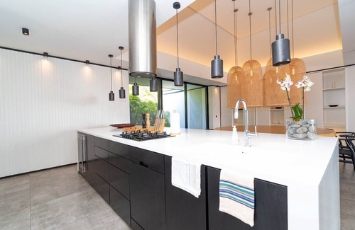 The well-equipped, ultra-modern kitchen is the perfect place to prepare your meals or to call upon a private chef for your events. All is soft and refined, in a pure atmosphere contrasted by velvet fabrics and natural fibers.