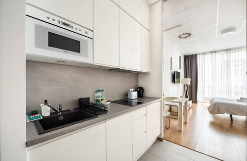 Varsovia Jerozolimskie Studio 215 has a stylishly designed room with a comfortable king size bed and a kitchenette and bathroom. Guests have a range of practical amenities at their disposal, including free WiFi, TV, iron, dishwasher, fridge, microwave with bake function, toaster and kitchen accessories. The flat is air-conditioned, which provides extreme comfort, especially on hot days.