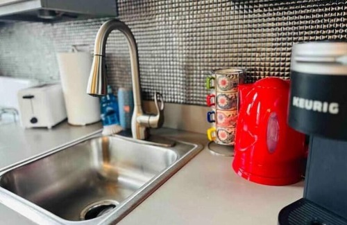 This light-filled loft features a stunning vaulted ceiling and a massive picture window overlooking the avenue. The king-size bed is so comfortable, guests often ask what brand it is. Below the sleeping loft is a dreamy walk-in closet with a single bed, and above it, a cozy futon accessible by ship deck stairs — ideal for couples but can comfortably host up to four guests.