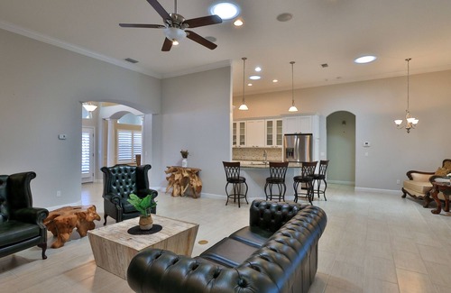 Long term rental information available. Enjoy the Florida Lifestyle of a Tropical Paradise close to a Beautiful Beach, Intracoastal Waterway, Great Golf Courses, and all the Central Florida Attractions. After enjoying a day trip return to relax in your own gated Secure Luxury venetian Bay Golf Estate with Estate treed Lot with Privacy Surrounding your Screened Lanai Pool, Enjoy Bonus Outdoor Living Room, Poolside Including Gas Fireplace, Flat Screen TV, California Kitchen, Dining Area and Extra Power Button Shutters for inclement weather. Enter your Open Floor Plan Tiled Living Space in Home, Sitting room/Den/Office, Formal Dining Room Off a Full Gourmet Kitchen with Breakfast bar, and Dining Nook. The Cavernous Livingroom Opens Up with a Split Plan for privacy of 3 carpeted guest rooms and 2 Full baths on the West Side of Home and access from Guest full bath shower is an entry door off the pool bonus room too. The East Side of Home with Sliders to a seating area poolside nice place to enjoy a drink off your Large Primary Bedroom with Flat Screen Tv, King Sized Bed with Ensuite Bath, Separate shower, Garden tub, Dual Vanity with multiple walk-in closets and safe room. If your needing Corporate High end housing for 6 months or longer check our availability. No 12.5% Sales tax if reserved 6 months plus 1 day or more. the heating fee is for pool and spa heater costs, there is monthly maintenance and clean fee included, pool service, utilities, lawn & pest service, high speed wifi included.