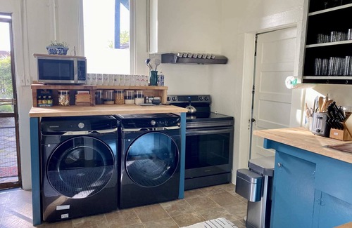The downstairs apartment features a spa-like bathroom and spacious living areas. Enter into the charming, well-stocked kitchen, where you will find everything you need for a delightful stay. Whether you plan to cook a lot or just want to enjoy our fantastic selection of teas, coffee, and treats, we've got you covered. The full kitchen also includes a washer-dryer, which you will be welcome to use (laundry detergent included).