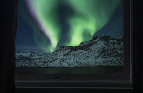 You will get great views from every window, overlooking the fjord and the mountains. During the right time, you can see the aurora or the midnight sun right from your bedroom, the balcony and patio.