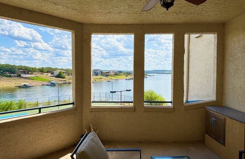 Beautiful lake and hill country views from the patio in a picturesque setting from this 2 Bedroom, 2 Bath lakefront condo at The Island on Lake Travis. This villa can sleep 6 and has a king bed in the master, queen bed in the guest bedroom, and a queen sized inflatable bed for the living room. This property has been fully updated and has 2 HDTVs along with high speed WiFi, full size washer/dryer, and large covered patio with grill. Access to all the Island Resort amenities including indoor/outdoor pools, hot tubs, restaurant, workout facility, tennis and more.