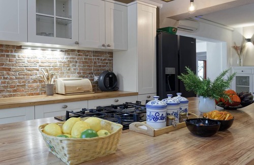 Beautifully designed kitchen is fully equipped with a kitchen island, stove and an oven, microwave, fridge with ice machine, water kettle, coffee machine, toaster and a dishwasher and an access to the pool view terrace with dining table and chairs for 12 people. Dining room has a dining table and chairs (sits 12 people) big sofa with relax area and flat screen SAT TV. The entire villa is air conditioned, WiFi is free and available throughout the property. Secure, private parking is free, available in front of the villa.