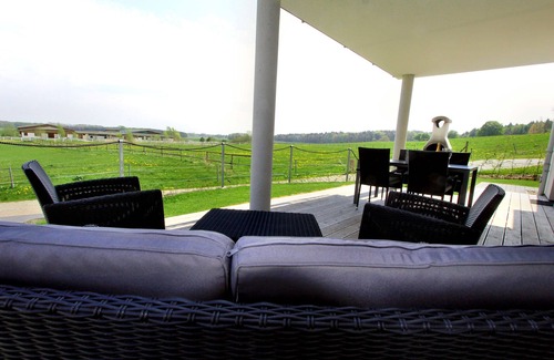 Luxury holiday VILLA ALBA / EC apartment: Unobstructed dream view of the paddock, private outdoor Jacuzzi, 2 bedrooms (+ HD TV), 2 bathrooms, sauna, SKY TV, DSL Wi-Fi, partly covered sun terrace, lounge furniture, barbecue & own Garden Villa Alba - Luxury ground floor apartment with unobstructed views of the horse paddock & private outdoor hot tub in the garden The Villa Alba consists of a total of 2 separate apartments. Each apartment has its own outdoor Jacuzzi and offers the highest level of wellness. Villa Alba was completed in the spring of 2013 with high-quality luxury equipment & many highlights. This exclusive luxury ground floor apartment with light flooded 88 m² living space has a total of 2 bedrooms, 2 luxury bathrooms, underfloor heating, partly covered, large wooden terrace, garden with private outdoor hot tub, 1 car parking lot and a private storage shed. The holiday property also convinces by a fantastic unobstructed view of the paddock and wide fields and meadows as well as the proximity to tee 1 of the castle course. The guests of the EC apartment is its own small SPA (own sauna and private outdoor Jacuzzi in the garden / year-round to 38 degrees) are available. Experience hydro massage jets with bubbly massage pleasure in every season - pure fun and relaxation. Not only the starry sky but also the dimmable multi-LED lamps integrated in the pool let the day fade away relaxed. This property is a Non smoking house. Therefore we ask you not to smoke in the object!This terrace apartment has an exclusively furnished living and dining area with an open kitchen and access to the partially covered wooden terrace (access to the apartment's outdoor Jacuzzi in the garden / only for holiday guests of this EC apartment!), brick charcoal grill (charcoal please bring along) and own garden with 2 sun loungers (incl. Pads). Enjoy an unobstructed view of the paddock from morning to evening. Relaxed breakfast on your terrace with delicious, fresh bread and baked goods, which brings a delivery service fresh in the morning or in the evening with an iced sundowner on the lounge set to enjoy the dream view - pure relaxation. The high-quality equipped living area with exclusive gas fireplace invites to relaxing evenings on the sofa. Experience TV or DVD evenings on the wall-mounted, large Full HD flat screen plus a high-quality home cinema system. On topp is available in the living area SKY-TV free of charge. Experience exciting Bundesliga, Golf, F1 or a current film in HD quality. The open, fully equipped kitchen is incl. Dishwasher, convection oven with ceramic hob, microwave, fridge / freezer, etc.) and complete, high-quality equipment (dishes, Leonardo glasses, cooking utensils, etc.). In addition, a Nespresso machine is available (please bring capsules). Enjoy pure spa pleasure in the daylight bathroom with floor-level, glazed Raindance shower, apartment-own sauna, mirror, designer vanity, festinst. Hair dryer, hanging toilet with soft-close & towel warmer. Relax, bathe or shower in your own music with a high-quality switch series with docking station for your iPhone / iPad incl. Integrated radio. In the 2. Wellnessbad is a floor-level, glazed spa shower, designer vanity, hair dryer, hanging toilet, towel warmer and an integrated radio. The 2 well-being bedrooms both have comfortable 180 x 200 m box spring beds (incl. Pillows + duvets), wardrobes, desks and chairs, as well as Full HD flat screens wall-hung in each bedroom. One bedroom has access to the terrace. The entire apartment is equipped with insect protection (tenter frame). A washing machine for free use is also available in the separate storage room (please bring your own powder). There you will find drying rack, ironing board & iron as well as cushions for the garden furniture. Enter from the living area through the patio door and through another patio door from a bedroom, the partially covered terrace & the private garden with private outdoor hot tub. Sun lovers come here on 2 comfortable sun loungers (incl. Editions) relaxes at your expense & enjoy the unobstructed dream view of the paddock. Enjoy a relaxing evening with a sundowner on comfortable and high-quality garden furniture (4 garden chairs, garden table, parasol). In addition, a lounge suite is available on the terrace. Culinary barbecue delights await you on the brick walled charcoal grill. Relax in our sauna and then in the year-round heated to 38 degrees outdoor jacuzzi (for sole use). A perfect combination of vacation and wellness! The feel-good equipment leaves nothing to be desired and relaxing holidays in an exclusive ambience are waiting for YOU. Let yourself be inspired by the EC apartment in the VILLA ALBA with exclusive interior, relaxing spa facilities & garden with unobstructed dream views of the paddock! Our holiday guests receive many special conditions from our cooperation partners, such as: At the Golf Club Fleesensee, at the SPAworld Fleesensee & at the bicycle rental. For booking requests / queries about this beautiful EC apartment in the Villa Alba, we are happy to help you by email or by phone. We look forward to welcoming YOU as guests at Villa Alba and wish you a relaxing stay already today. Best regards from the Fleesensee