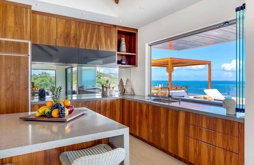 The interiors take full advantage of the view and outdoors. The great room is open and airy with a unique beamed ceiling, more like art than architecture. It is a stylish space with sleek contemporary lines blended with exotic touches; teak and rattan furniture are adorned with neutral fabrics and interesting art and decor. The interior layout makes this villa perfect for multi-generational families. The expansive great room seamlessly blends the lounging and dining areas with a beautiful modern kitchen in elegant woods, upscale appliances, and a view.