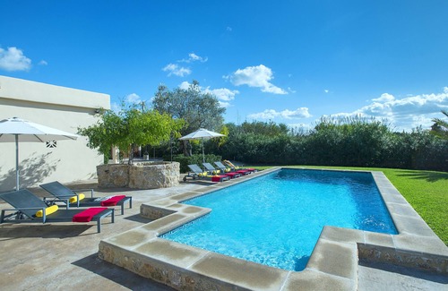 Enjoy an amazing dinner with friends and family under the open sky at the large veranda table, close to the stone made BBQ or just relax on the sunbeds close to the pool the summer sky of Mallorca.