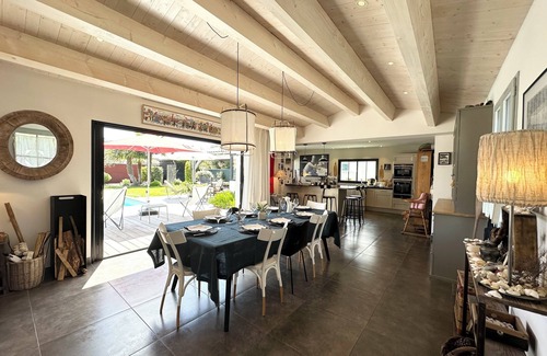 Large single-storey villa offering a large living room with a kitchen open on one side to the dining room and on the other to the courtyard, fully equipped with all large and small appliances, a dining area open to the outside and the swimming pool, a comfortable TV lounge also open to the outside and the swimming pool, Wifi6 + fiber.