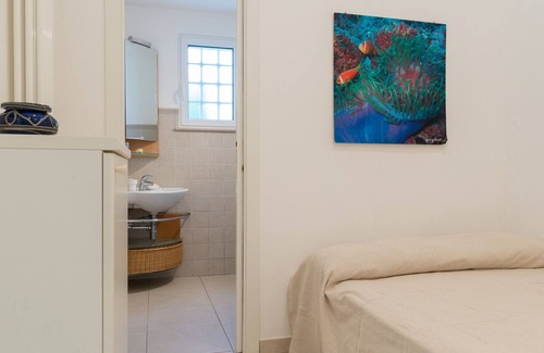 Located on the ground floor with direct access from the street, it consists of a large and spacious living area with open kitchen and 3 bedrooms, one with a double bed, one with a French bed and en-suite bathroom and a third single bedroom with a second pull-out bed that can be set on request. The furnished veranda and the garden, with an outdoor shower perfect for cooling off under the sun, complete the villa.