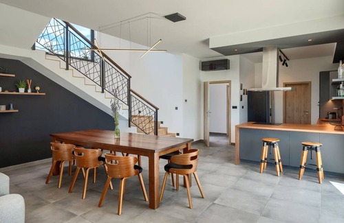 The interior of the villa covers 199 m² and consists of 2 floors. On the ground floor, you will be greeted by an open plan space, furnished with high quality furniture and high tech appliances. The kitchen is fully equipped and ready to prepare delicious meals to be enjoyed at the dining table. Next to the kitchen is a living room with comfortable sofas and a Smart TV. There is also an indoor fireplace to keep you warm on colder days, and thanks to the double sliding balcony doors, you will always have a view of the outdoor terrace. The room is dominated by a combination of wood and metal, which brings a touch of industrial style. All rooms are air conditioned.