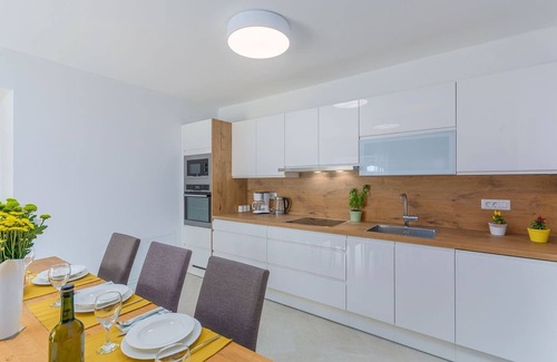 The very modern decorated ground floor of the villa Corticum Otium consists of a living room, the center of which is a striking blue, corner sofa, located opposite the smart TV. An open passage leads to the dining room connected to an elegant white high gloss kitchen. A touch of warmth is provided by the wooden kitchen countertop that matches the dining table, which creates a harmonious design of the room. The kitchen provides all necessary appliances, and you can also get a children's highchair on request.