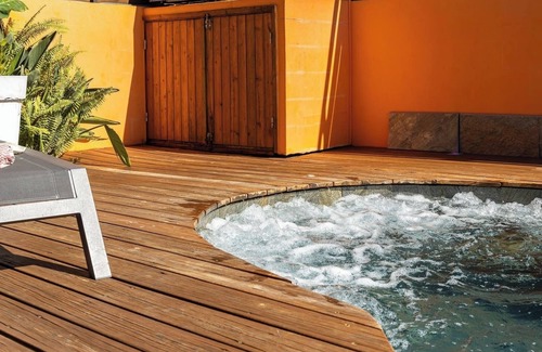 - A veranda opening onto a space with swimming pool equipped with deckchairs and garden table
